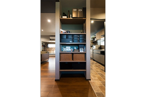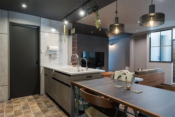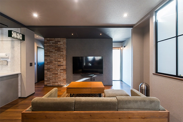 リビングにはヌックスペースとレンガタイルのアクセントが映える、表情豊かな住まいです。