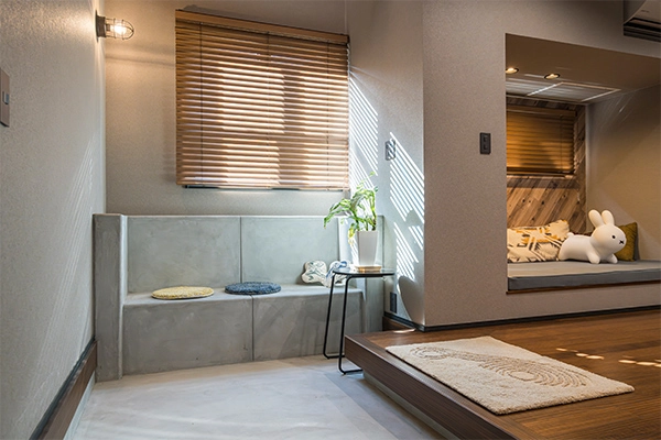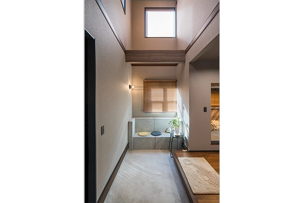 玄関は吹抜けの開放感が広がり、モルタル仕上げの造作ベンチが空間のアクセントに。