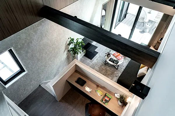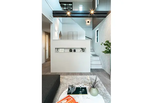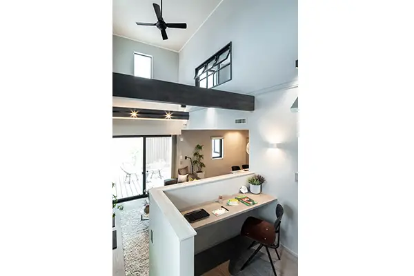 吹抜け、リビング、ガレージ、平屋のような間取り、省エネ・創エネの暮らし、リモートワーク、土間、スキップフロア、広々ランドリー、第2のウッドデッキ中庭、シアタールームなどがこの1棟で体感できる。